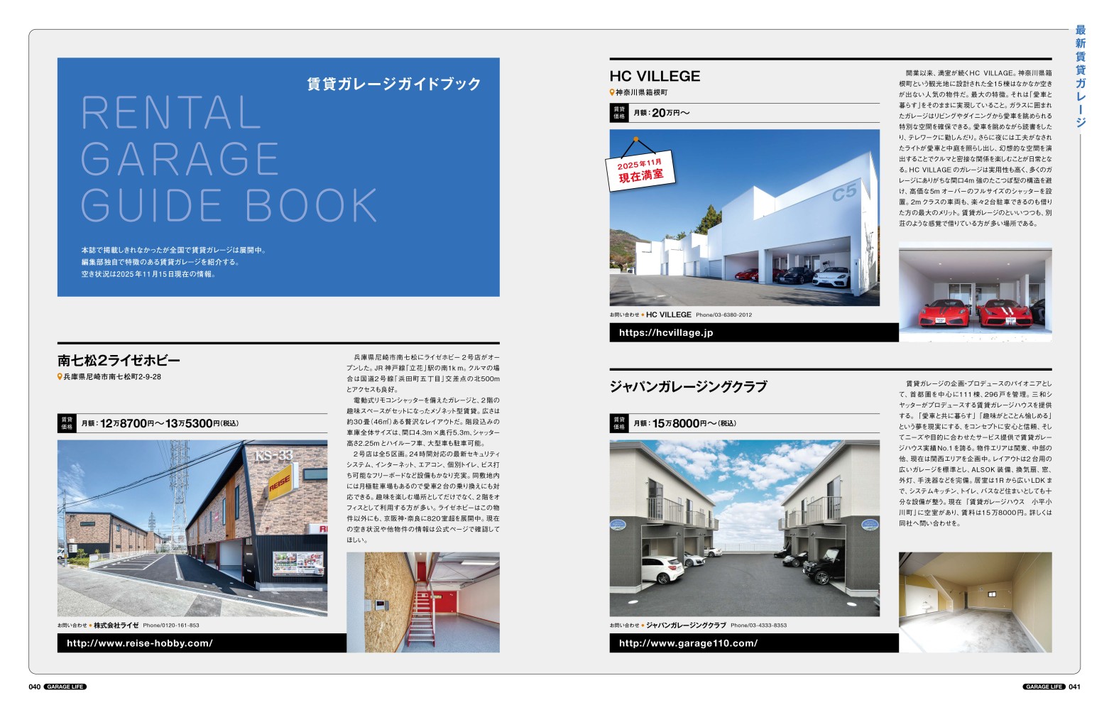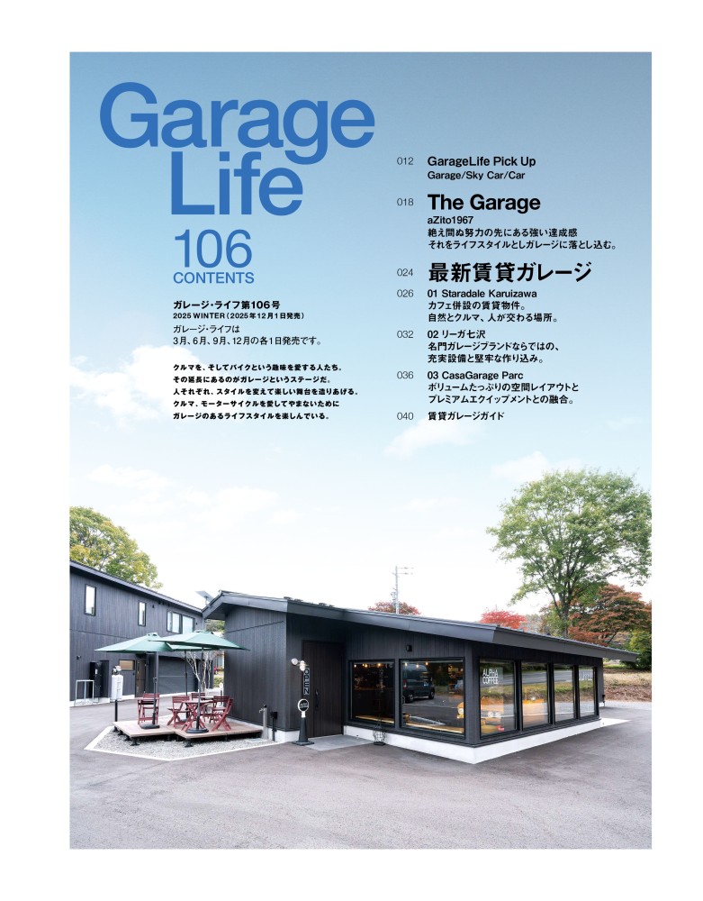 GarageLife106の巻頭特集は賃貸ガレージ。3軒の賃貸ガレージの紹介のほか、ガイドブックとして11軒の賃貸ガレージの情報を掲載。2025年11月現在の空室の情報を紹介している。またThe Garageのほか、豪華でありながらもこだわりのガレージを10軒掲載。また先日、SUPER GTから引退を表明した松田次生選手と訪問した海外のガレージも紹介している。特別付録は2026年1年間使用ができるGarageLifeオリジナルカレンダー。カレンダーの購入を考えている方は、この機会をお見逃しなく。