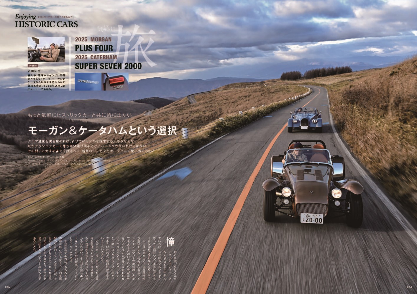 しかし今回は、従来の“名車紹介”に留まらず、ヒストリックカーをより多面的に捉え、その魅力と世界の広がりを深く掘り下げる内容としました。巻頭を飾るのは、誰もが胸を高鳴らせるイタリアン・スーパーカー。いずれもV8エンジンを搭載し、似たパッケージを持ちながらも、走りも佇まいもまったく異なる個性を放つ2台の競演です。続いて紹介するのは、日本の軽自動車規格黎明期を象徴するマツダR360クーペ。可愛らしいフォルムと独創的な佇まいは、半世紀以上を経た今もなお新鮮で、時代の空気まで想像させるほどの存在感を放っています。さらに、正統派ヒストリックカーとして外せないのがジャガーEタイプとマークII。異なるボディに同じエンジンを搭載したこの2台は、スポーツとラグジュアリーという対極の世界を、ひとつの技術で表現した名作です。今回は視野をより広げ、クラシックなスタイルを守りながら進化を続ける“モダンクラシック”にも注目しました。代表格はイギリスのモーガンとケータハム。最新テクノロジーの恩恵でロングツーリングも快適に楽しめ、ヒストリックカーの空気感をより手軽に味わえる人気のモデルです。また、ヒストリックカーのデザインエッセンスを現代車へと落とし込んだレトロモダンモデル、国内外のイベントレポート、こだわりのパーツ、そして新しい購入スタイルまで――。ヒストリックカーの愉しみ方を、ティーポならではの切り口で展開いたします。