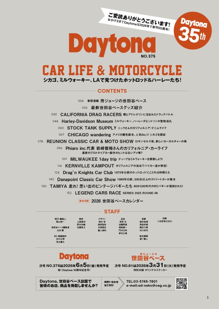 Daytona NO.375号では丸ごと一冊「ハーレー&ホットロッド」をテーマに編集。カリフォルニア、シカゴ、ミルウォーキーの現地の取材を中心に、ハーレー・ダビッドソンや古いアメリカ車を中心に、カッコいい乗り方を10テーマの大型特集で紹介させていただく。
