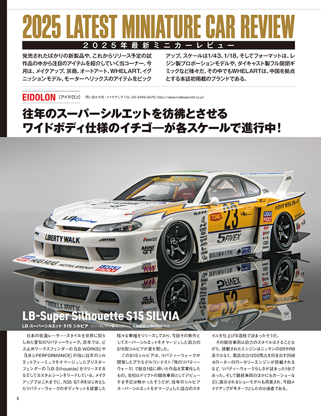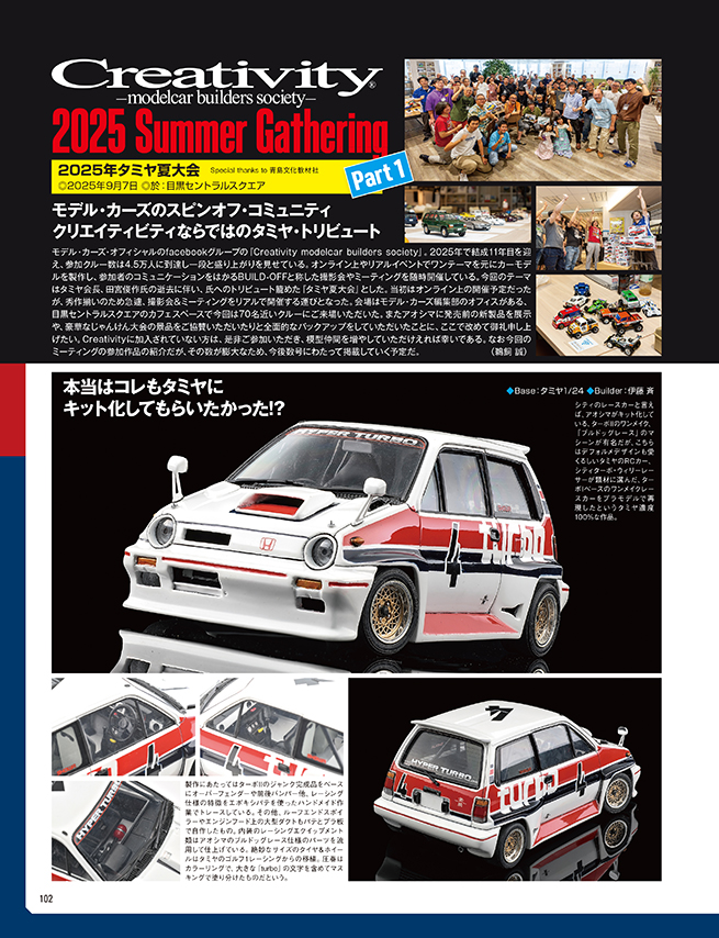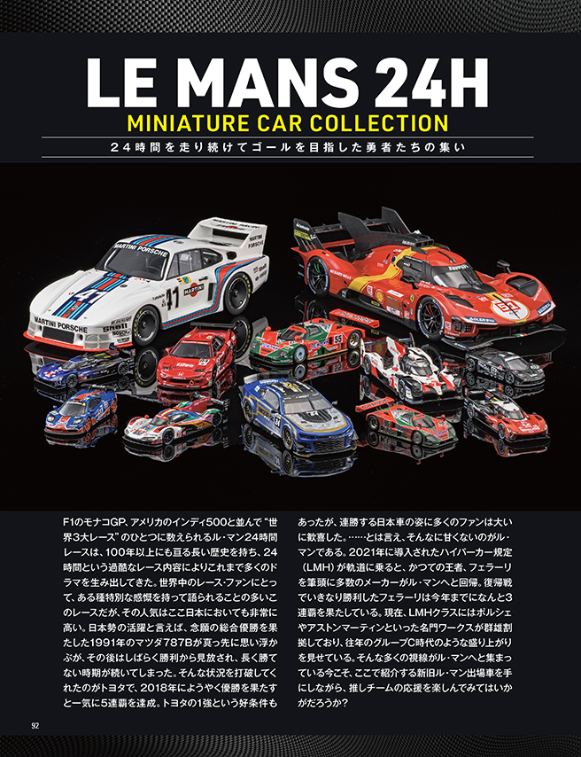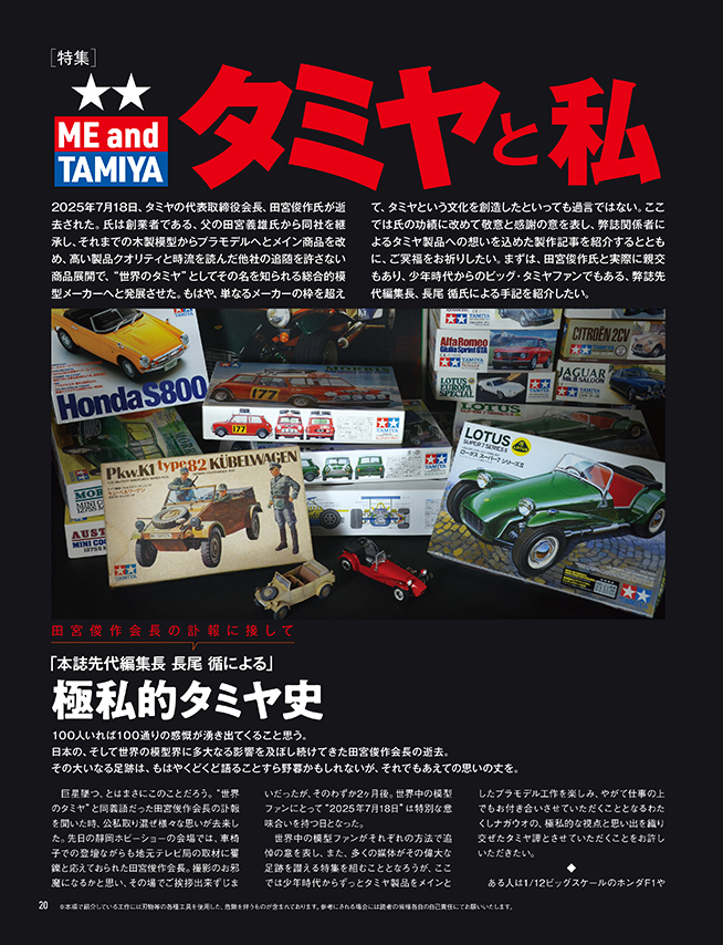 2025年7月18日、タミヤの代表取締役会長、田宮俊作氏が逝去された。氏は創業者である、父の田宮義雄氏から同社を継承し、それまでの木製模型からプラモデルへとメイン商品を改め、高い製品クオリティと時流を読んだ他社の追随を許さない商品展開で、“世界のタミヤ”としてその名を知られる総合的模型メーカーへと発展させた。今回は、氏の功績に改めて敬意と感謝の意を表し、弊誌関係者によるタミヤ製品への想いを込めた製作記事を紹介するとともに、ご冥福をお祈りしたい。また、本誌に合わせてモデル・カーズ・オフィシャルのfacebookグループ『Creativity modelcar builders society』のメンバーによる、氏へのトリビュート籠めた『タミヤ夏大会』が開催され、集まった力作も多数掲載。その他は、ミニカーの小特集として、近年再び盛り上がりを見せているル・マン24時間を出走した歴代のマシーンを集めた『LE MANS 24H MINIATURE CAR COLLECTION』など、今回も充実の内容となっている。