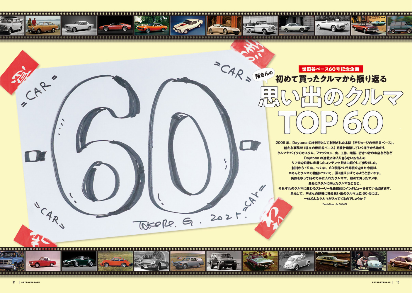 創刊から19 年、60号目という節目を迎えた今回は、所さんとクルマの物語について、深く掘り下げております。所さんが免許を取って始めて手に入れたクルマや、初めて買ったアメ車、最もカスタムに拘ったクルマなどなど、それぞれのクルマに纏わるストーリーを徹底的にインタビューさせていただきます。果たして、所さんの記憶に残る思い出のクルマ上位60 台には、一体どんなクルマが入ってくるのでしょうか?