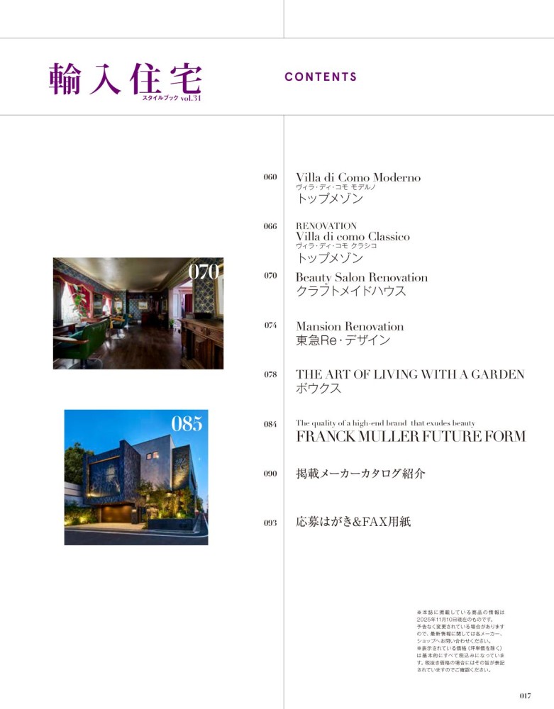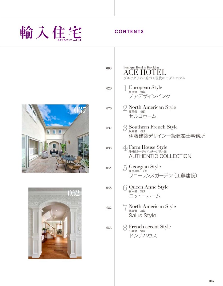 輸入住宅スタイルブック31号は輸入住宅実例8軒とリノベーションをした実例3軒や「欧米に学ぶ、庭づくりの提案」など掲載。巻頭のホテルは、ブルックリンのACE HOTELをピックアップ。住宅様式だけではなく、インテリアなど参考にする方も多い1冊