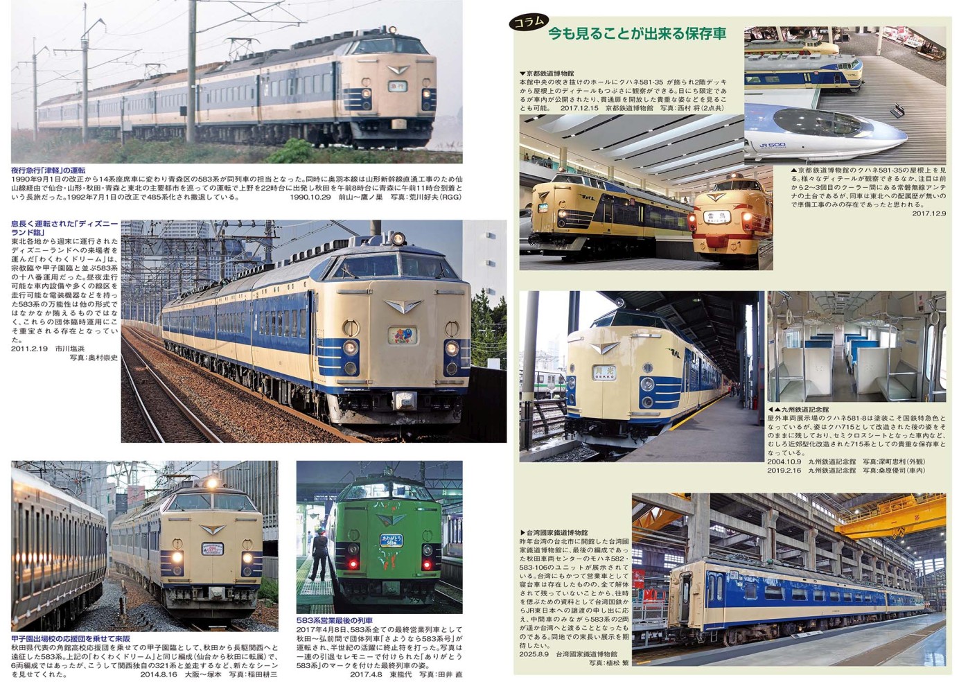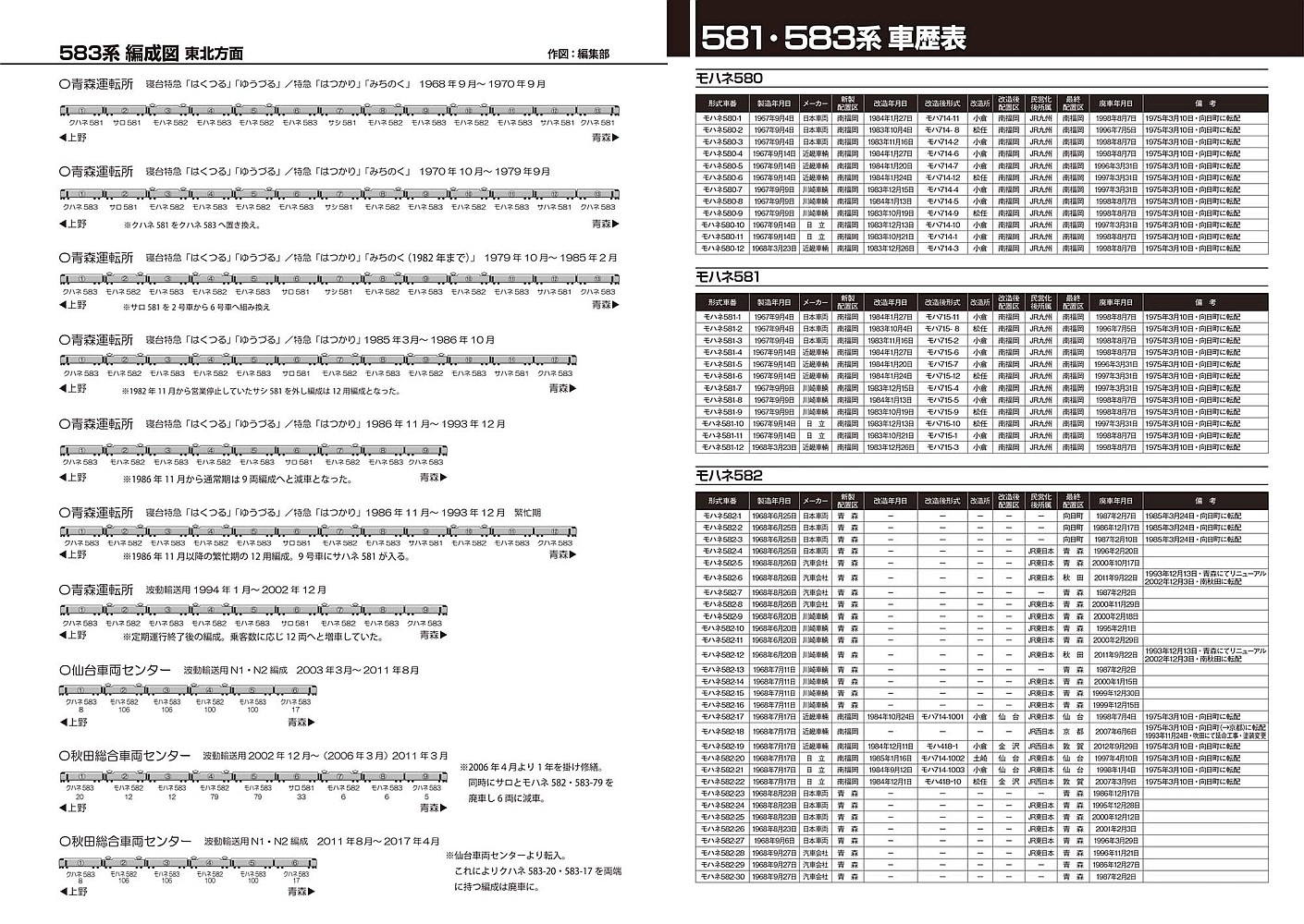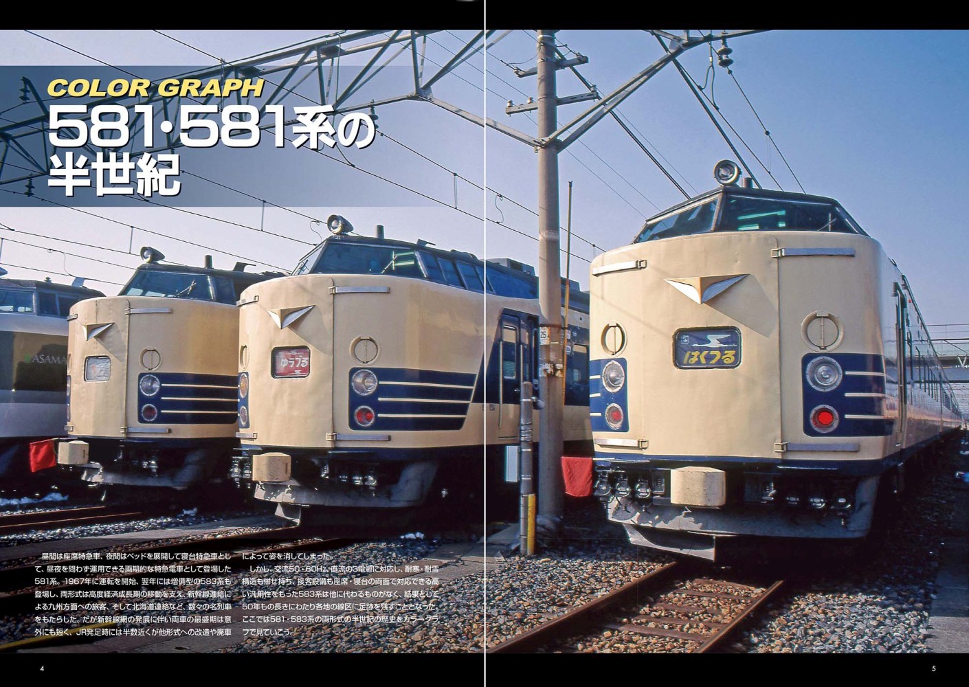 ~~~~~~本書の内容~~~~~~~~~・581・583系 運転系統図・COLOR GRAPH 581・583系の半世紀・SPECIAL GRAPH 583系国鉄色 最後の輝き・形式概説 581・583系・581・583系の各形式を見る・近郊型改造形式を見る 715系0・1000番代編・近郊型改造形式を見る 419系編・581系・583系 定期優等列車の変遷表・681系量産車を見る・681系量産車の各部を見る・車内を見る・屋上・床下を見る・The side view 秋田車 N1・N2 編成の側面を見る・The side view 京都総合B6編成 急行「きたぐに」の側面を見る・583系形式図・583系編成図・581・583系車歴表
