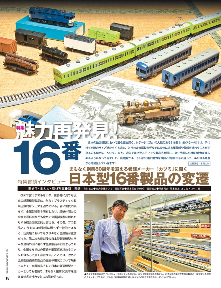 現在日本で普及している鉄道模型において最も歴史深く、Nゲージに次いで人気のある16番。手に持った際のサイズ感からくる迫力、とりわけ金属製モデルでは実物に迫る重厚感や質感を味わうことができるのも魅力の一つです。また、近年はプラスティック製品も台頭し、より16番が楽しめるようになってきました。そんな16番の魅力を今号と次号の2回に亘って、あらゆる角度から再発見していきます。