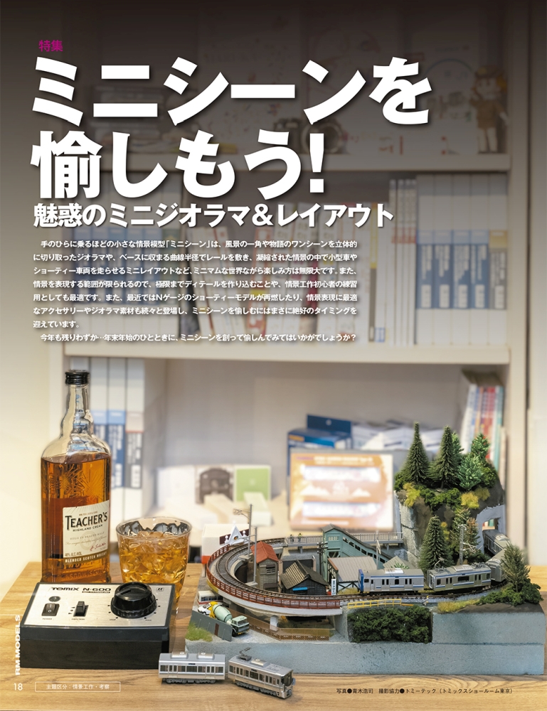 ・クリスマスの街角・Qトレミニレイアウト3題 富山の鱒のすしに展開する「懐かしの鉄道情景」・Q鉄 足尾銅山線 ―鉱山街風景が展開するA3サイズNゲージレイアウト―・T-TRAKサイズで「名物跨線橋」復活!・架空鉄道‟いすでん”の始発駅を作る・3者3様の個性!撮って楽しめるNゲージミニジオラマ3題・ミニシーンのススメ 小さきことは楽しき哉・・・・モデルズ陸運局特集内特別版 バスコレ用に作り込んだロードサイドの情景・模景“謎”探検 ゴミだらけの倉庫と廃棄された貨車・旅ラマ~養老渓谷駅の風~