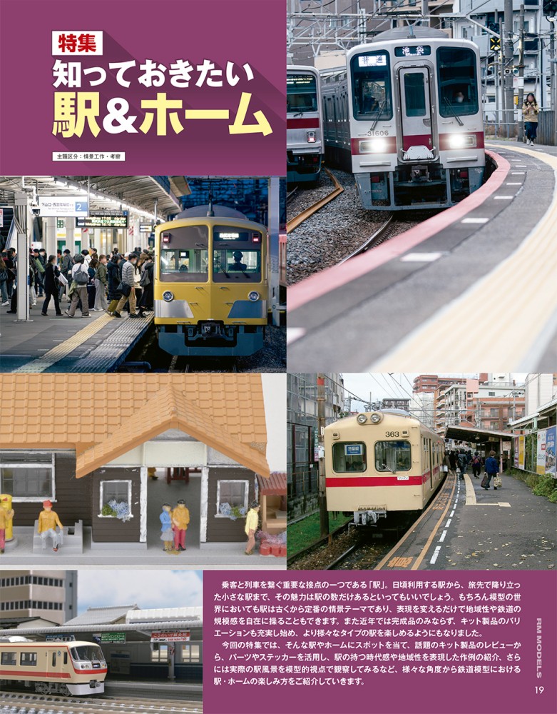 【特集】知っておきたい駅&ホーム・今ドキの駅ホームを観察しに行こう!・実景観察を活用しよう!東武&西武着色済対向式ホームの実力を見る!・駅的!!ビフォーアフター・紙の駅から見える景色・なんでんかんでん大百科スペシャル 駅とホームのアクセサリーパーツ昭和編・16番だってホームが欲しい!・駅と線路の組み合わせ・消えた駅風景 西鉄宮地岳線パート1