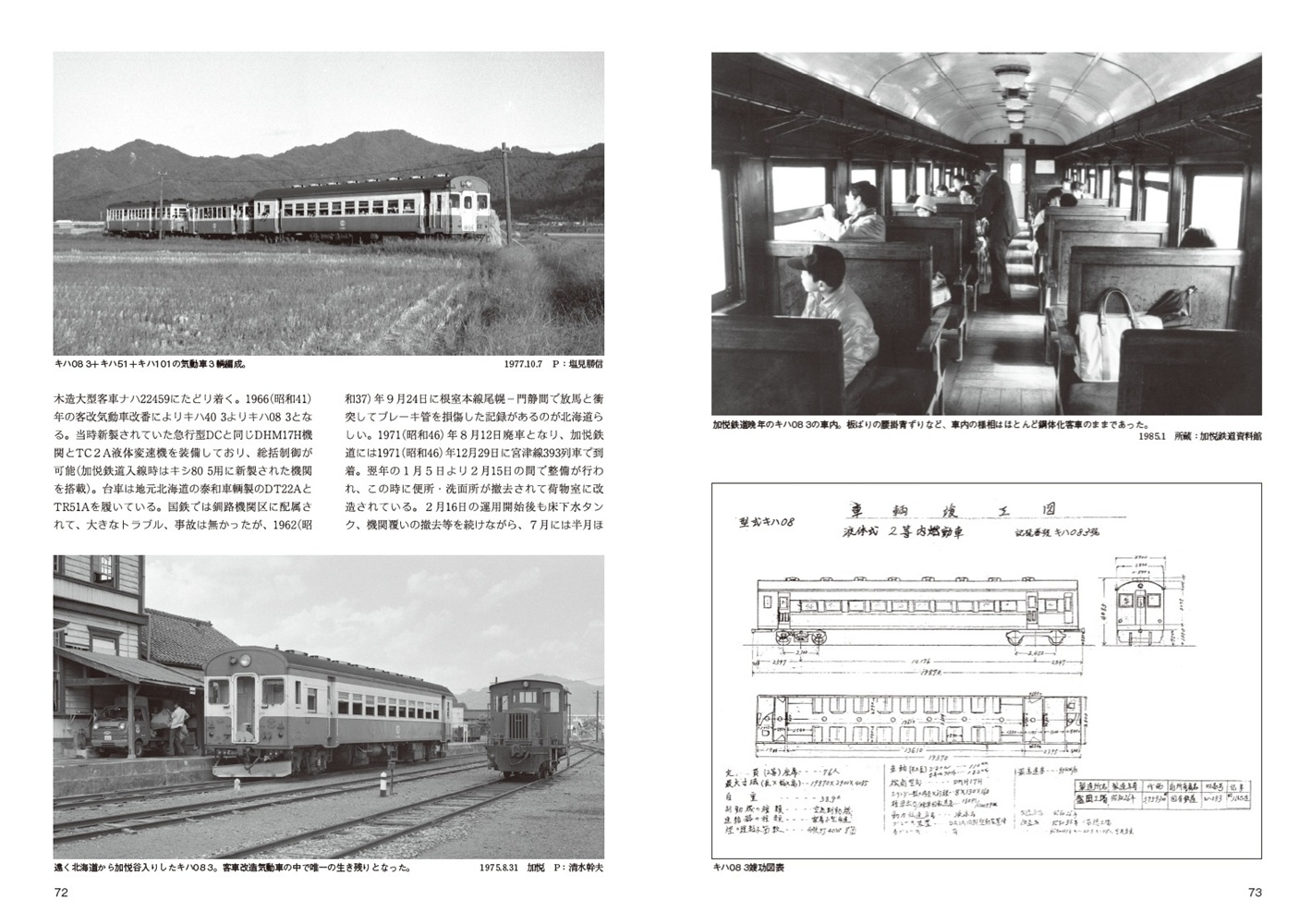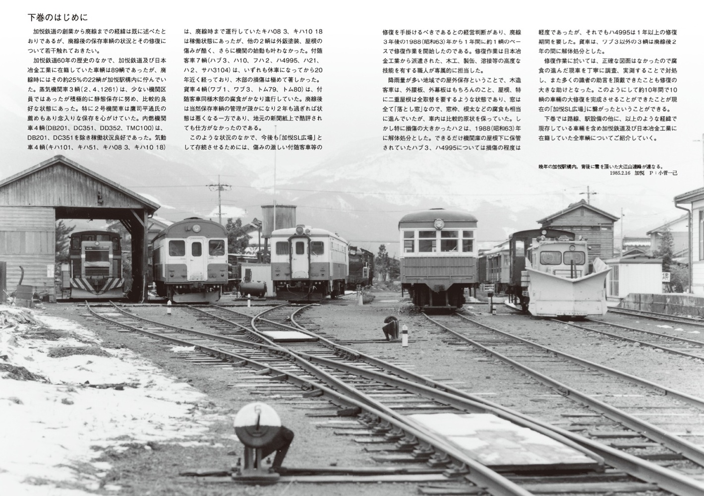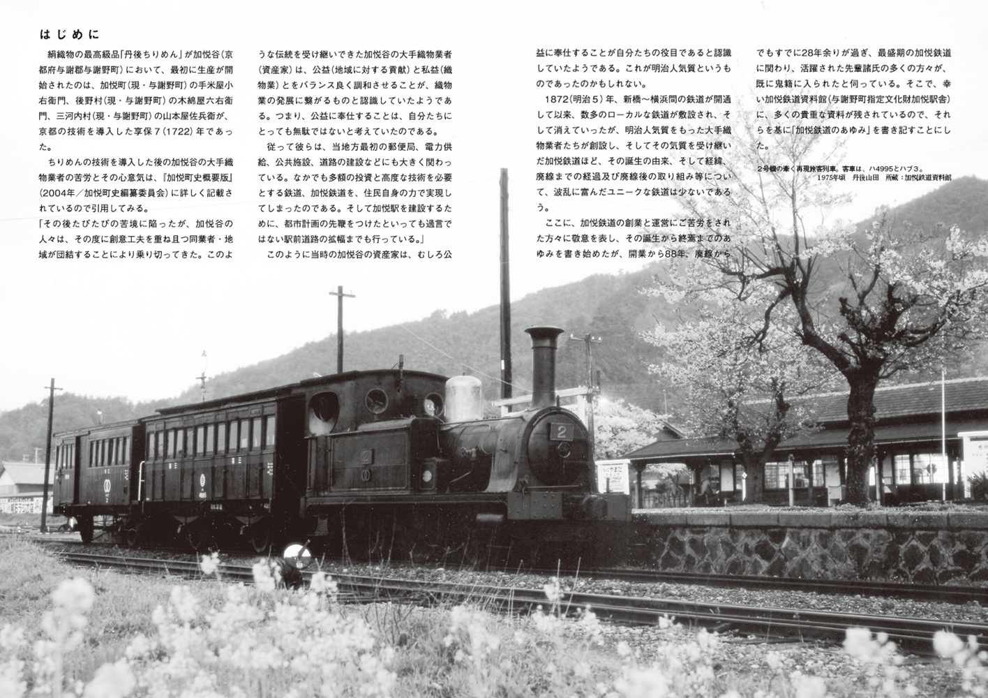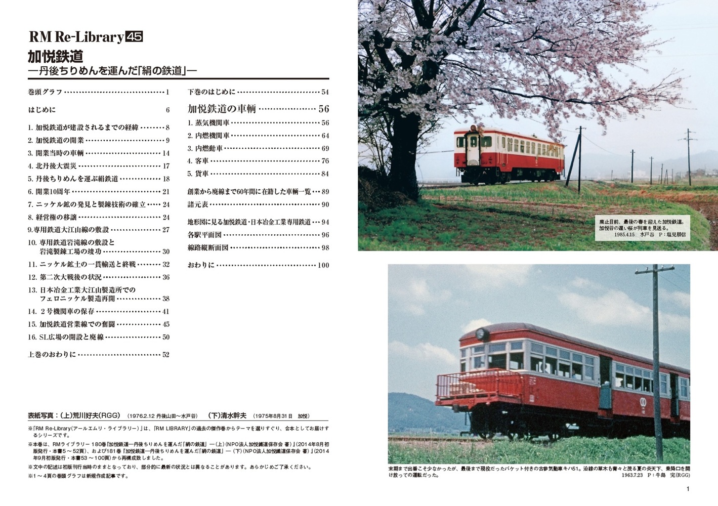 ついに300巻を超えた長い歴史の「RM LIBRARY」から、過去の傑作巻を2~3冊分まとめて復刻する「RM Re-Library(アールエム リ・ライブラリー)」。シリーズ45巻目は、RMライブラリー第180・181巻「加悦鉄道―丹後ちりめんを運んだ「絹の鉄道」―」(共にNPO法人 加悦鐵道保存会 著)」を取り上げます。 加悦谷と呼ばれるエリア、現京都府与謝野町は古くから絹織物の最高級品「丹後ちりめん」の産地として知られていましたが、大消費地である京都との物流はかなり不便であり、幾度もの鉄道誘致の試みが為されましたがなかなか実現せず、ついに地元資本家を中心に住民自身の力にて丹後山田(当時の国鉄宮津線、北近畿タンゴ鉄道野田川駅を経て現京都丹後鉄道与謝野駅)~加悦間5.7kmの非電化路線を1926(大正15)年12月5日に開業させたのです。つまり本年2026年は同鉄道開業100周年でもあります。 こうして「絹の鉄道(てつみち)」として誕生した加悦鉄道ですが、戦前に終点加悦駅の少し先に発見されたニッケル鉱山によって大きく性質が変わります。戦時中の戦略物資として重要視されたニッケルの産出のため、加悦鉄道は両端に日本冶金工業の専用鉄道がつながり、片や鉱山、片や精錬工場という形で、貨物列車が通しで運転されるようになりました。この規模の鉄道として、機関車や貨車の両数が異例に多かったことが、この時期の活況を現していたと言えるでしょう。 戦後はニッケル鉱山は一時を除いて休止となり、専用鉄道も精錬工場方のみが残され細々とした貨物輸送と旅客輸送で生き延びてきましたが、工場出荷貨物のトラック移行によって引導を渡される形で1985年4月30日をもって営業を終了しました。 その時点で残されていた車両たちはその後長年「加悦SL広場」にて大切に保存されてきましたが、それも2020年で閉園。幸運な車両は別の保存場所へ移動しましたが、残された車両の現在は不明な状況となっています(本書は「広場」閉園前の時点で編纂された記述となっています)。本書前半では、加悦鉄道資料館などに残された貴重な資料を用いた沿革を、そして後半では車両について形式図や諸元表を含めて詳細に取り上げています。保存活動に携わるNPO法人のメンバーが力を合わせて取り組んだ渾身の一冊と言えるでしょう。